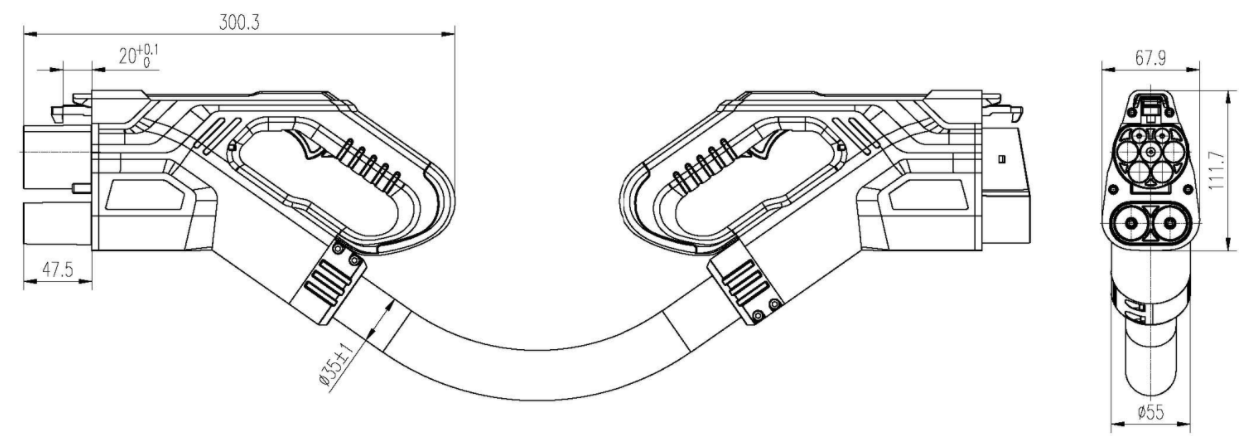 With this adapter, you can connect Combo 1 (Type 1 CCS-Female) electric cars to Combo 2 (Type 2 CCS-Male) fast-charging station.
