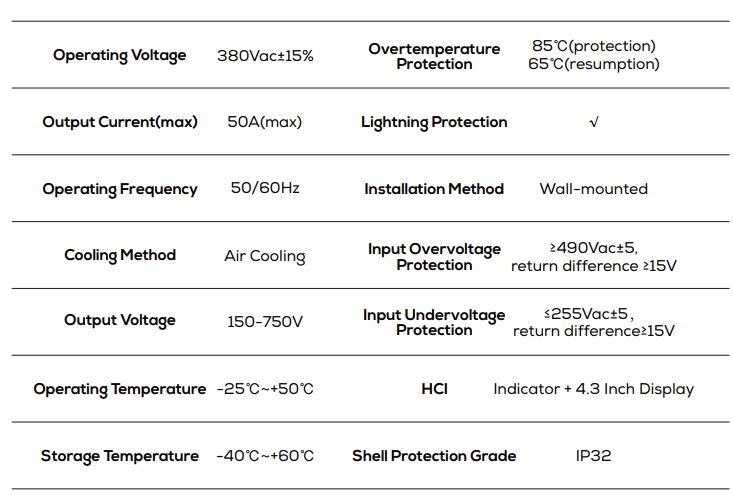 ◆ Using high-performance charging modules, wide voltage output range from 200-750Vdc