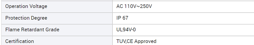 Insulation resisitance:>1000MΩ Therminal temperature rise:<50K Withstand voltage:2000V Working temperature: -30°C ~+50°C Contact Resistance: 0.5m Max